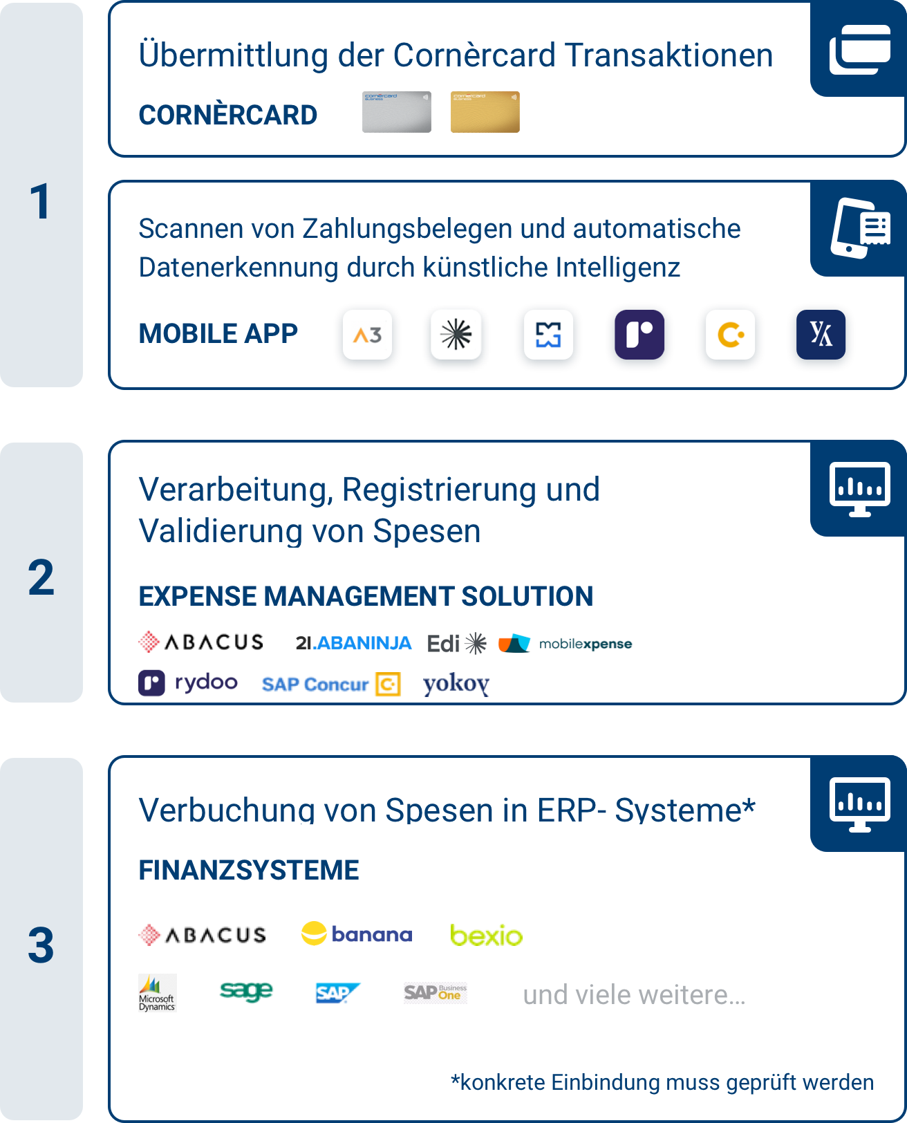 Die Business Karten werden in die Expense Management Tools unserer Partner eingebunden, um die Transaktionsdaten automatisch darin zu übertragen (Abacus, AbaNinja und EDI in Echtzeit; MobileXpense, Rydoo, SAP Concur, Yokoy, Zoho und Zucchetti tagesaktuell). Unsere Partner bieten verschiedene Möglichkeiten zur Integration in ERP-Systeme.