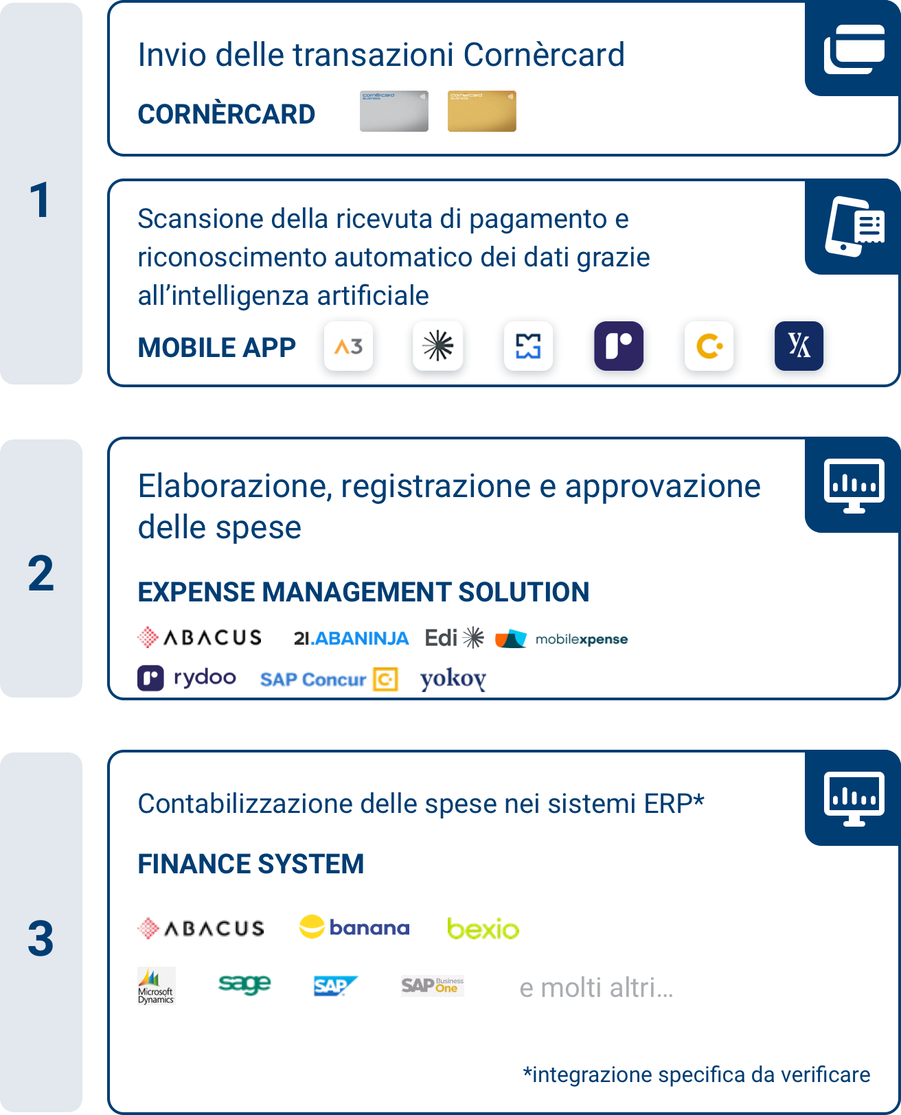 • Le transazioni di Cornèrcard compaiono in tempo reale negli Expense Management Tool (Abacus, AbaNinja e EDI in real-time / MobileXpense, Rydoo, SAP Concur, Yokoy, Zoho e Zucchetti giornalmente).